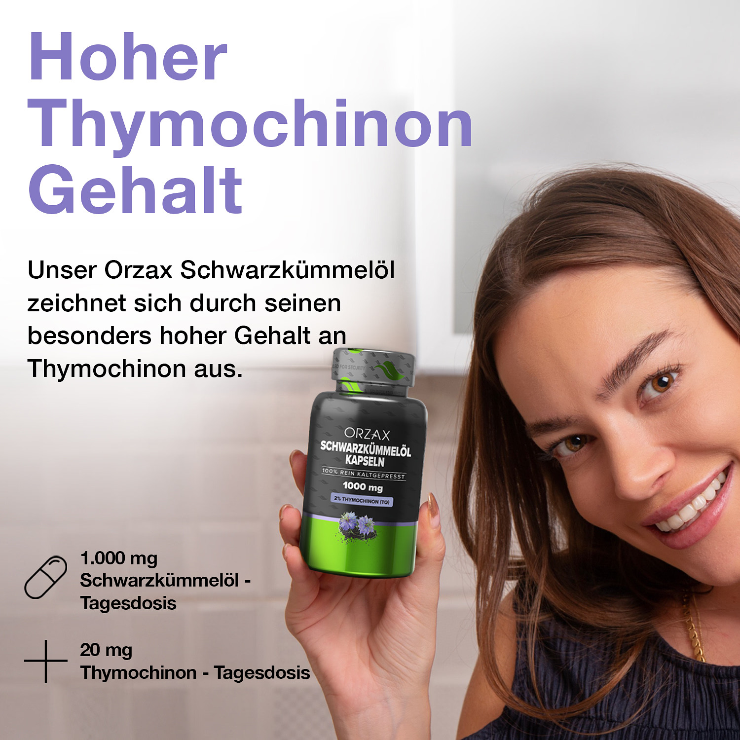Orzax Schwarzkümmelöl enthält pro Weichkapsel 1000 mg kaltgepresstes Schwarzkümmelöl (Nigella sativa) mit einem standardisierten Gehalt von 20 mg Thymochinon.